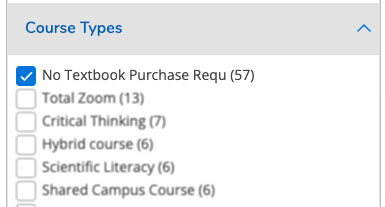 A list of courses is shared each semester. Please note that not all sections are ZTC for some courses. Check the course description in Self-Service to confirm there is no cost for textbooks.