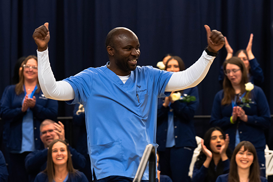 Gerald Gwambuga of Sellersville celebrates during the 54th annual pinning ceremony at Bucks County Community College, a tradition that marks the symbolic welcoming of nursing school graduates into the profession. Gwambuga, who immigrated from Uganda in 2017, leaving behind a 15-year career as a teacher, delivered the commencement speech to the entire class of 2025 the following day. One of his four daughters is following in his footsteps and is pursuing a nursing degree at Bucks.