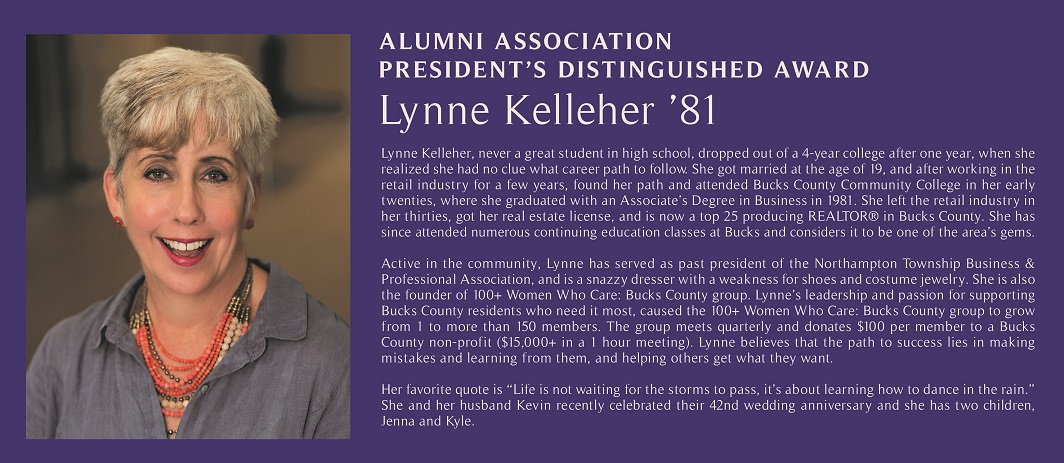 Lynne Kelleher, never a great student in high school, dropped out of a 4-year college after one year, when she realized she had no clue what career path to follow. She got married at the age of 19, and after working in the retail industry for a few years, found her path and attended Bucks County Community College in her early twenties, where she graduated with an Associate's Degree in Business in 1981. She left the retail industry in her thirties, got her real estate license, and is now a top 25 producing REALTOR in Bucks County. She has since attended numerous continuing education classes at Bucks and considers it to be one of the area's gems.